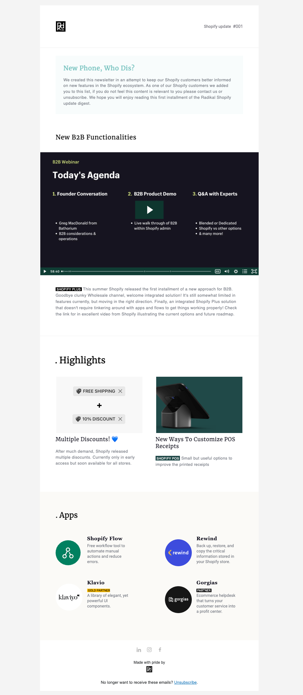 We keep track of all the changes in the Shopify ecosystem and digest it in a clean overview, so you don't have to.